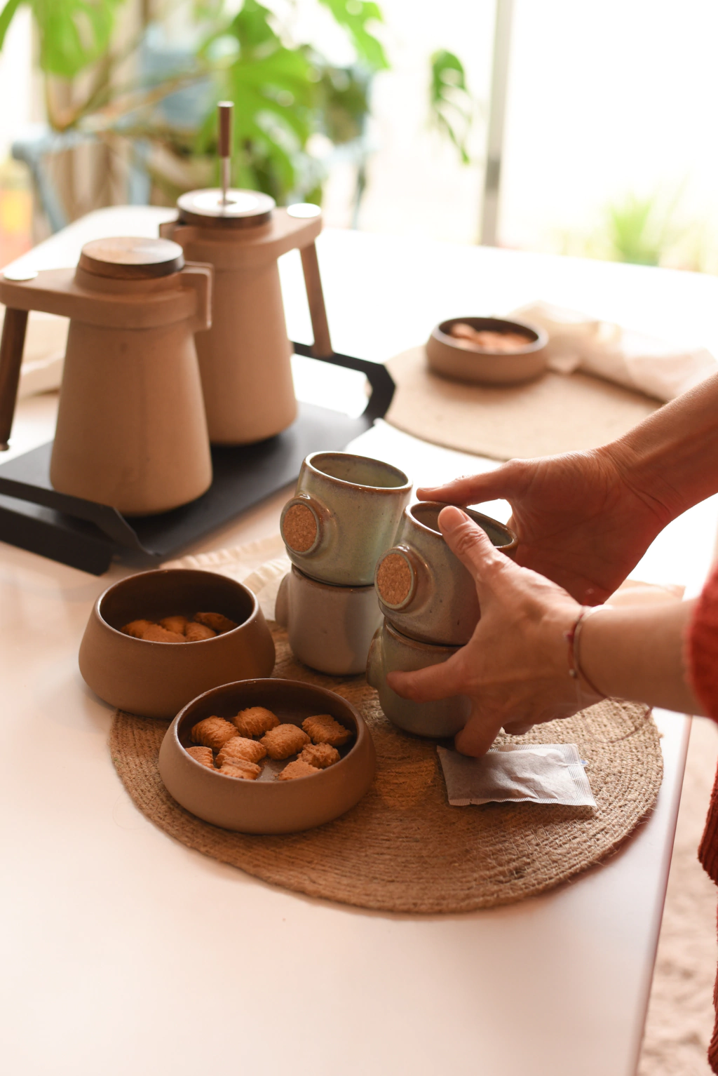 En esta línea, nos enfocamos en repensar el concepto de asa y el gesto de agarre, buscando que el calor del café no afecte el confort del momento. Por eso, incorporamos detalles de corcho en el área de contacto, que suavizan el agarre y ofrecen una experiencia distinta a las tazas convencionales.